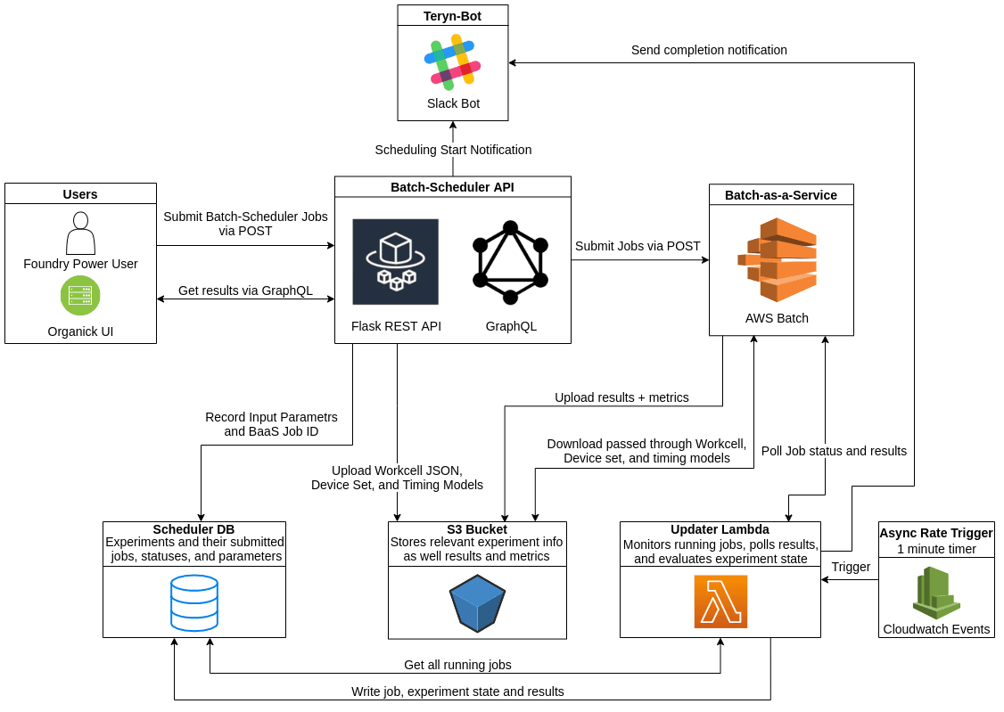 While this worked, it was prone to failure and had load limitations due to a reliance on the manual setup of Celery workers. The re-architecture aimed to resolve both of these issues. The primary change in the re-architected system was moving the computationally intensive constraint solving from celery workers to Batch-as-a-Service (BaaS). BaaS is an internal tool that provides an abstraction on top of AWS Batch that makes setting up the infrastructure and submitting jobs significantly easier. The move to BaaS posed an interesting challenge since it is a closed asynchronous system where no results are directly returned and there is no completion notification. I had to implement an asynchronous lambda function that would poll BaaS jobs and write results to our database as they become available. Another big benefit of this new architecture is that we are now able to access the results of individual scheduling runs as they finish rather than waiting for the entire batch to finish. This allows scientists to run a workable schedule as soon as one becomes available rather than waiting for marginally more efficient schedules to be computed. Since we now rely on Batch job definitions rather than hosted celery servers, we are able to automatically deploy them from our CI/CD pipeline with no downtime for users. Additionally, we can now support multiple SCLE code versions so Foundry users who required different features can work concurrently on the same system.