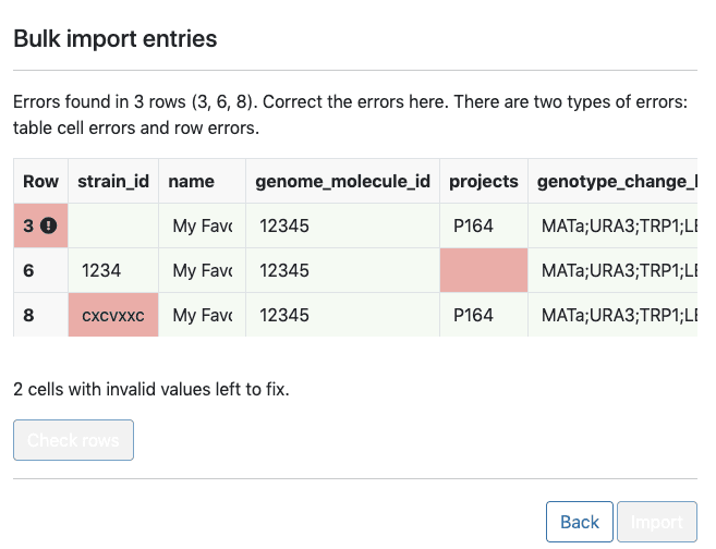 Standardized information about each banked strain, such as strain origin and usage, must also be recorded in Ginkgo’s laboratory inventory management system (LIMS). To do this, scientists upload a CSV file containing metadata for many strains to LIMS.