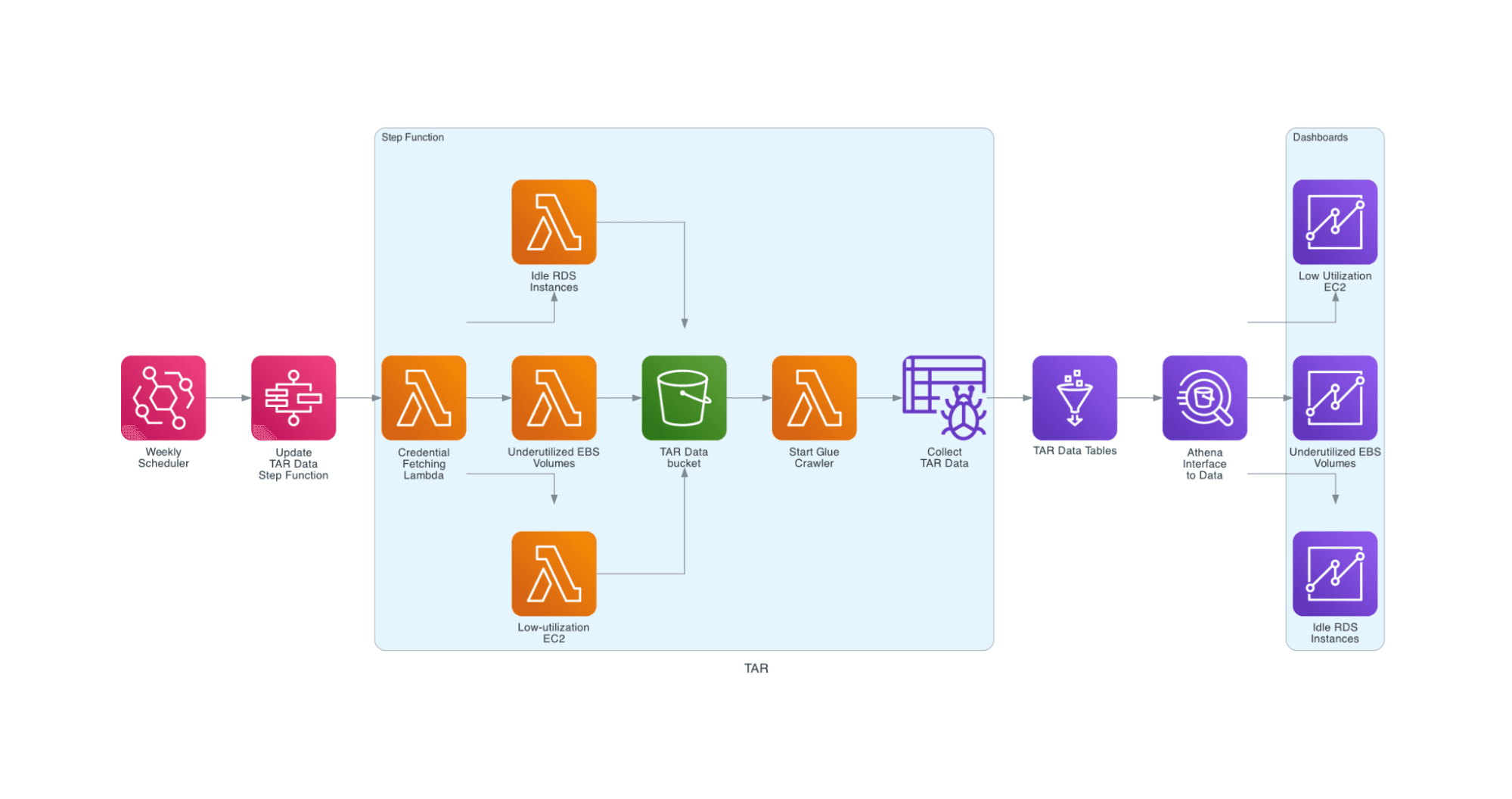 My project provides a cloud-native method for extracting and visualizing Trusted Advisor Report data. On a regular schedule, an AWS Step Function runs a lambda to log in to each AWS account and pull its Trusted Advisor Reports in parallel. These reports are then paired with some additional account information and certain fields are parsed into the proper format. From there, the step function kicks off an AWS Glue crawler to pull the reports into a Glue database. Finally, an Amazon Quicksight dashboard renders the data into interpretable and interactive visuals.