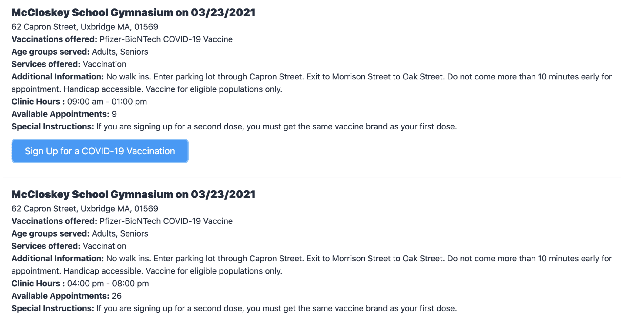 Web scraping is a bit of an art that involves a lot of detective work and puzzle solving. To solve this part I had to look under the hood of the vaccine appointments websites to try to understand their structure and how they worked, then program some code to read them. For this post, we’ll be looking at the maimmunizations.org website, which was the first site added to the bot. It lists appointments like this:
