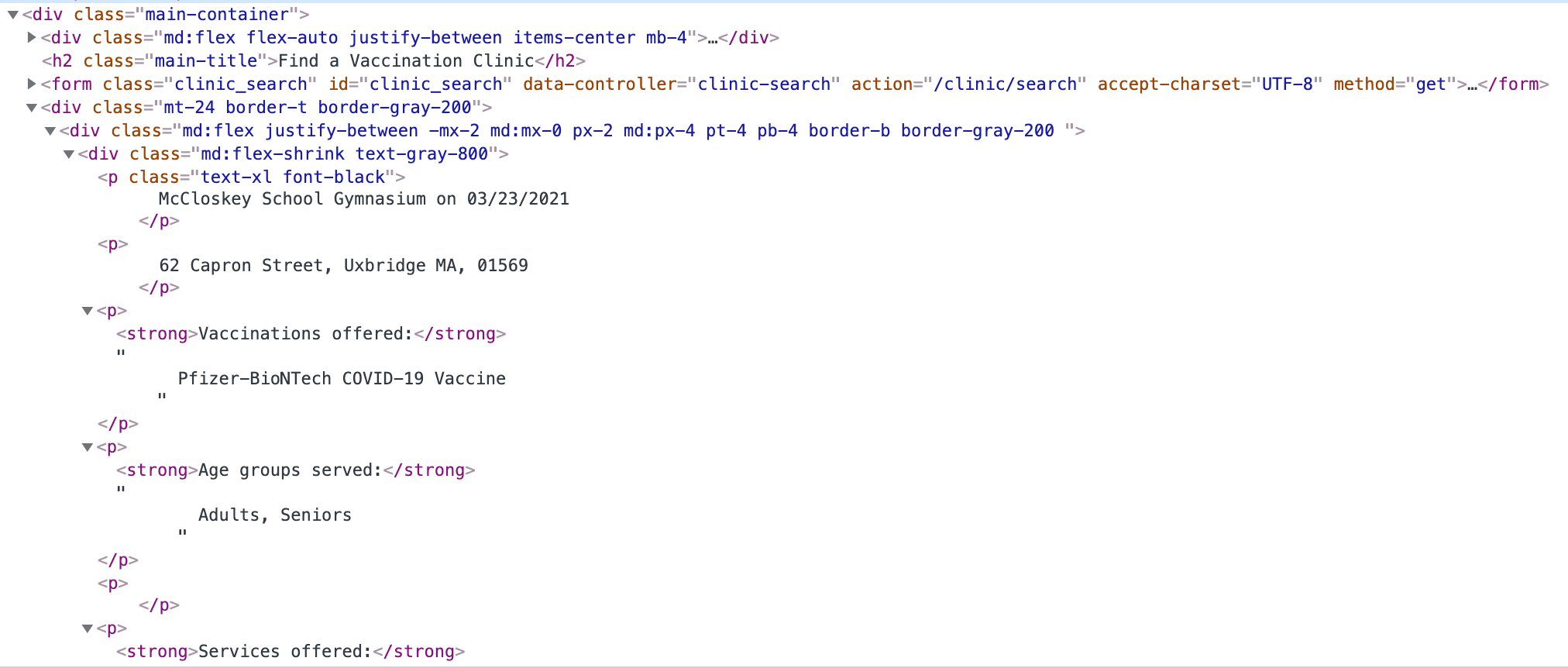 HTML tags are the basic building blocks here and are delimited by angle brackets like <p>. For the maimmunization.org site, information for each clinic is contained in some <div> tags each with the class “justify-between”. Each one of these sections includes the name of a clinic, the date, and some <p> (paragraph) tags listing further information including the vaccine type, age groups served, and available appointments. To easily parse and work with this page data, vaccinetime uses the rest-client and nokogiri Ruby gems. rest-client is a simple HTTP and REST client for Ruby, and Nokogiri is an HTML parser. The code for parsing the structure of the page roughly works like this: