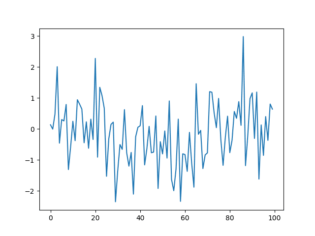 x = np.random.randn(100)For any dataset, you can use the built in plotting function of matplotlib to generate a line graph. With only one variable, the variable will appear on the y-axis with the index on the x-axis. Using the default plot configurations: