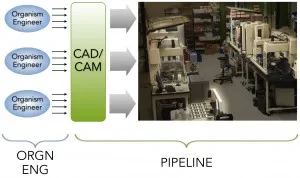 Here I'll try to give a high-level picture of Ginkgo's pipeline for organism engineering. If you've checked out our webpage, you'll see that we have several different organism engineering projects happening at Ginkgo that span several different hosts. Our goal was to build out a pipeline that could support the engineering of all these very different organisms for very different purposes but that uses a shared pipeline. To accomplish this goal, we deliberately opted to decouple design from fabrication. Ginkgo organism engineers place requests via our CAD/CAM/LIMS software system. Those requests are then batched and run on Ginkgo's robots.