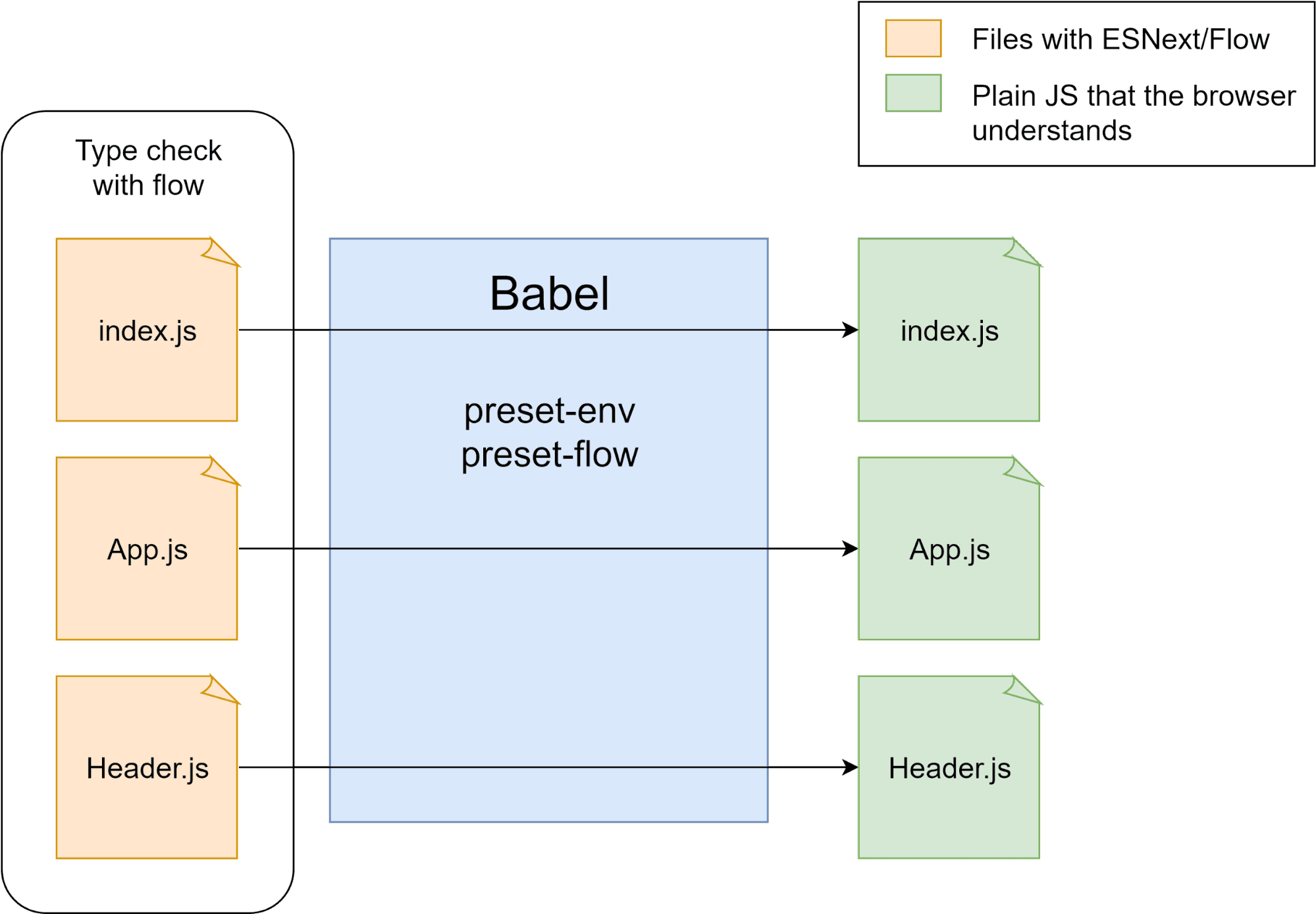 To start with, let’s briefly discuss our usage of Babel. We use Babel to transpile our Flow typed JavaScript code with the preset-flow preset, which removes the type annotations and leaves vanilla JavaScript that the browser can run. We separately use "flow-bin" to do type checking.