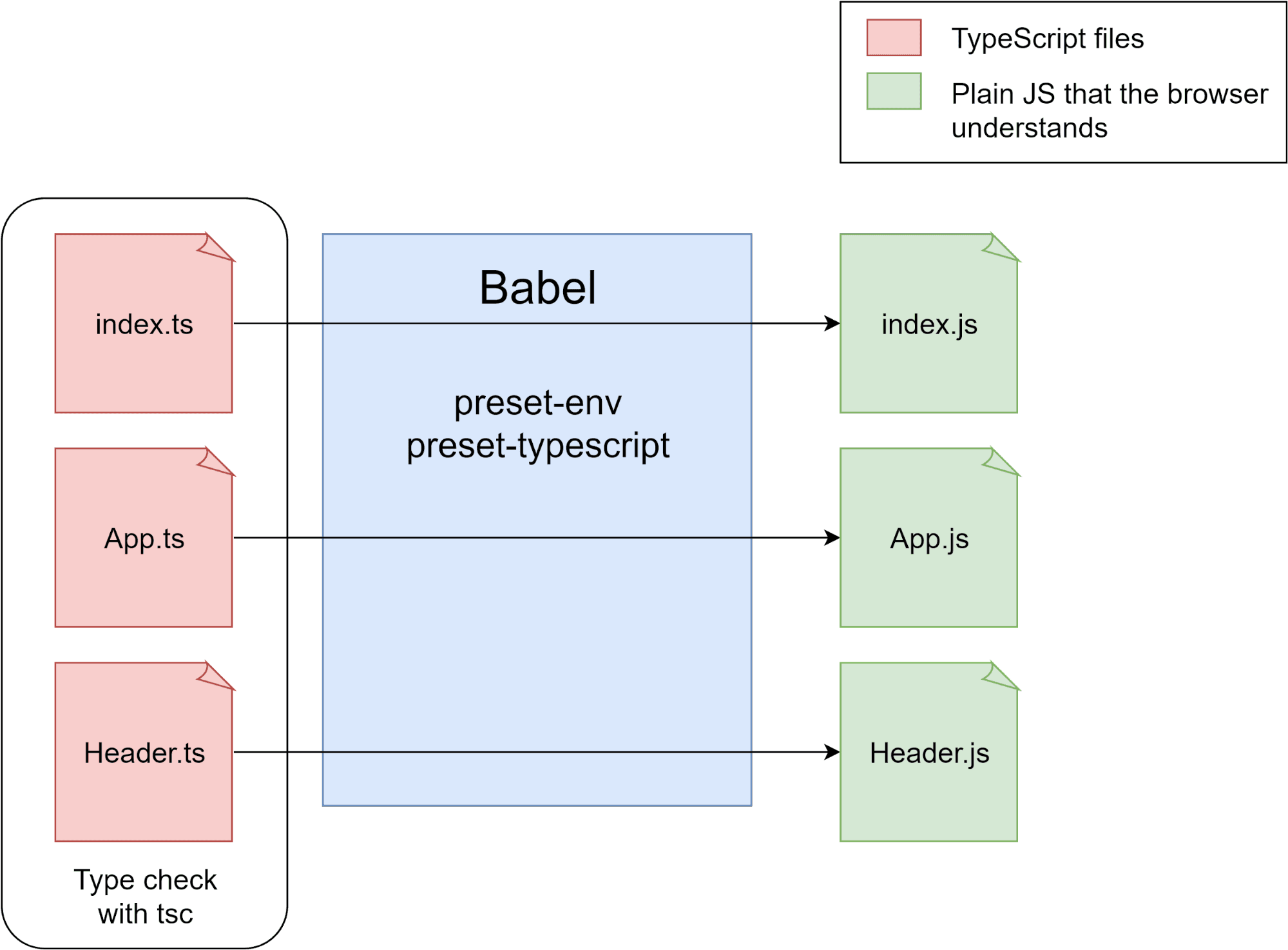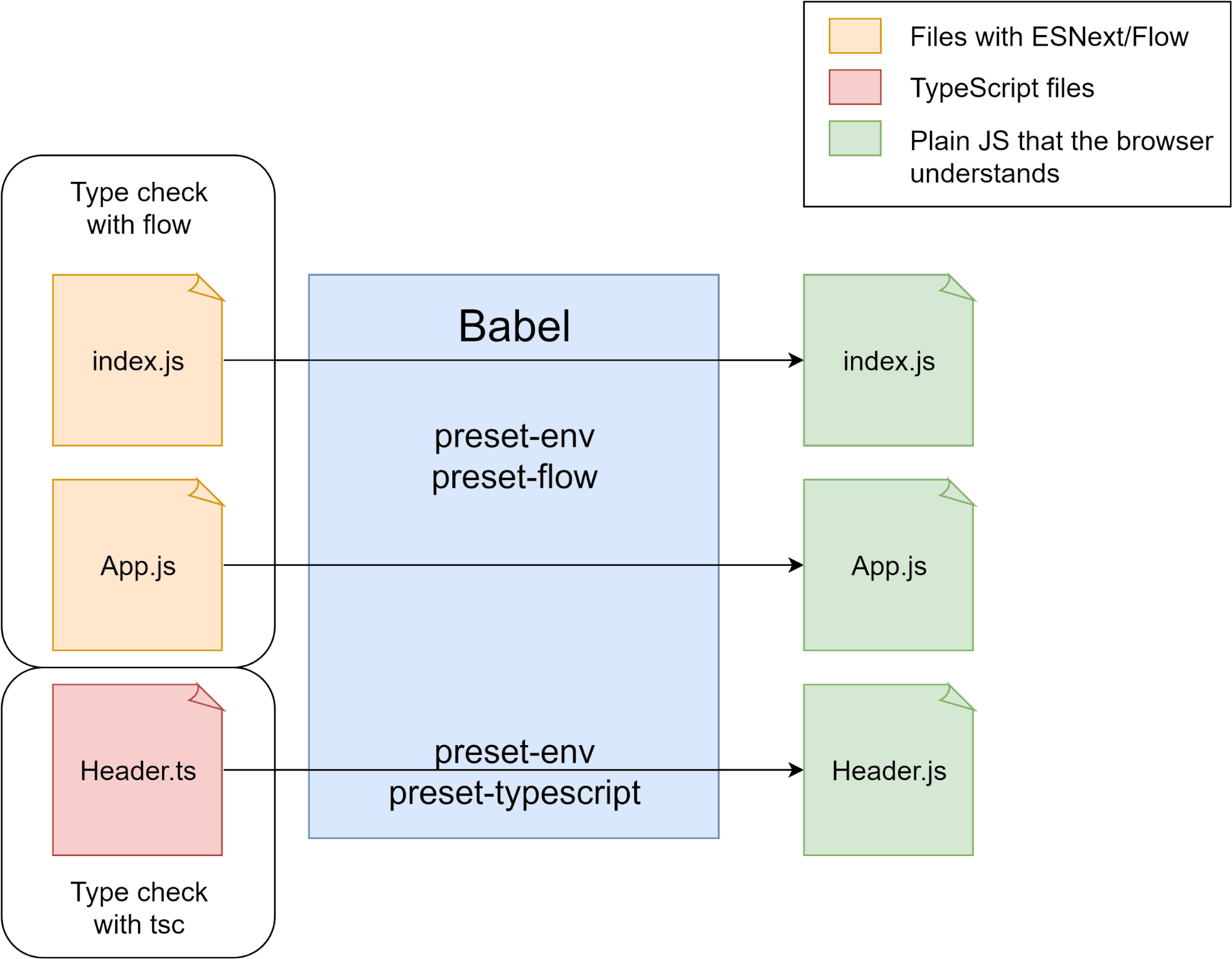 With TypeScript, we’ll also be using Babel to strip its types and will use tsc separately for type checking. Roughly, our old Babel pipeline looks like this: