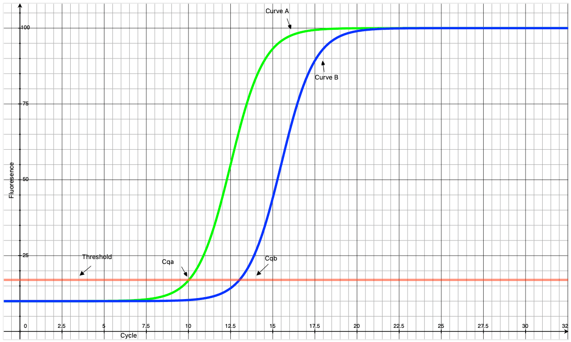 So how can we use these results to measure relative quantities of DNA? Well keep in mind that the amount of DNA doubles after each cycle. Thus, if curve A comes up 3 cycles earlier than curve B, then we would expect curve A to represent a sample with 23 or 8 times higher the concentration of genetic material than the sample represented by curve B. One simple mechanism to make this determination is to simply draw a horizontal line called the threshold and determine at which cycle curves A and B intersect with the threshold. The cycle of intersection is called the Cq or cycling quotient where smaller Cqs represent larger quantities of DNA.