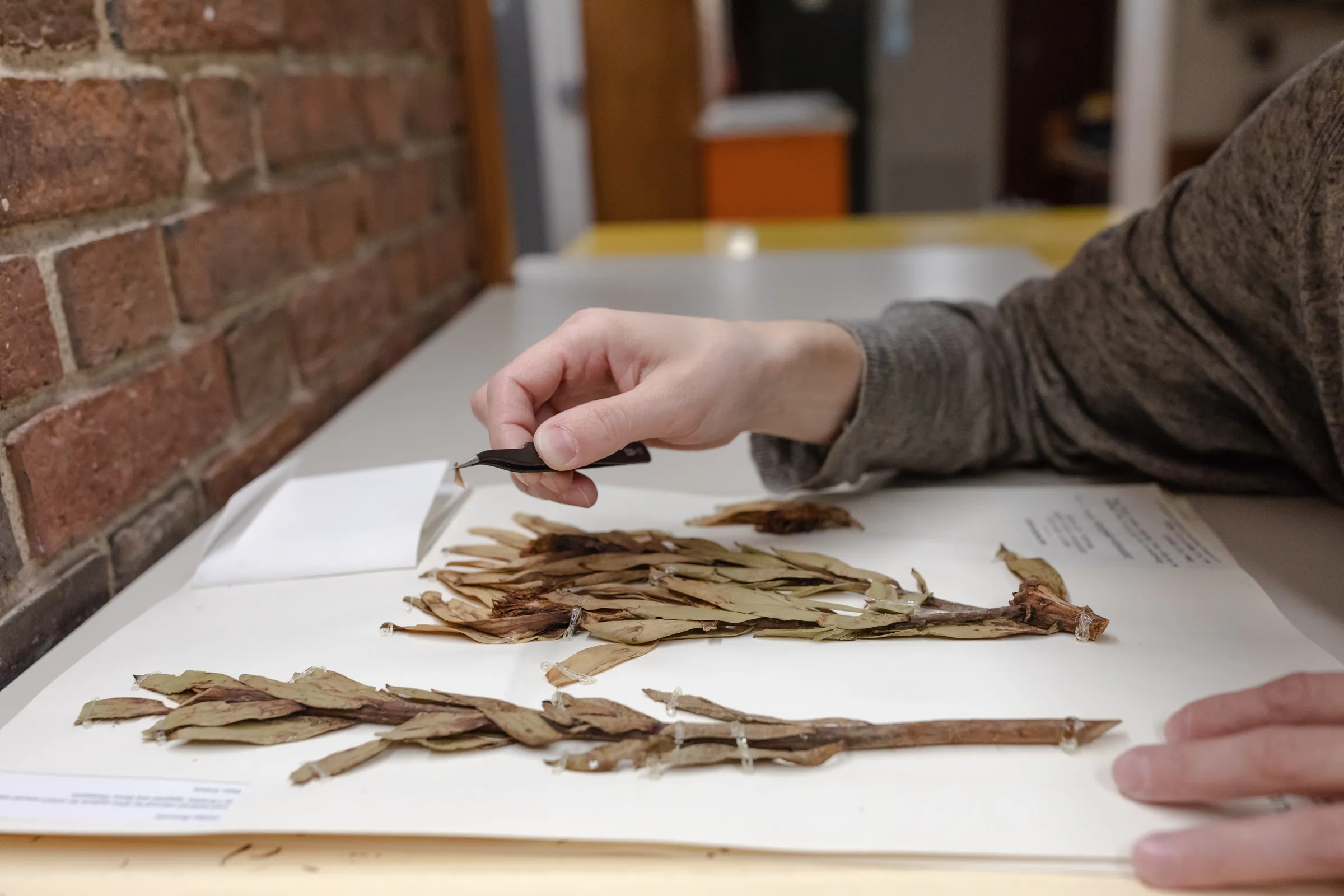 A lot of people at Ginkgo and beyond have been involved in bringing this project to life, from the earliest explorations about whether it would be possible with Jason Kakoyiannis all the way through the first exhibition opening. In 2016 I visited the Harvard Herbarium with my former colleague Dawn Thompson on a mission to find extinct plants. Together, we combed the stacks for preserved specimens of plants from the IUCN extinction list. From the more than 5 million samples in the herbarium, we found about a dozen extinct specimens that we could take tiny bits of leaf from. We worked with the UC Santa Cruz Paleogenomics lab to uncover sequences of DNA involved in fragrance production, which our colleague Jue Wang stitched together electronically into two thousand different versions. A team led by organism engineer Christian Ridley used those sequences to build strains of yeast harboring the extinct DNA, and test engineer Scott Marr measured the lost scents each strain made.
