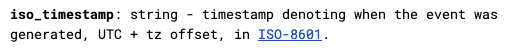 The doc should define the format of specialized primitives to prevent misinterpretation. Any event that uses such types must follow the definition. In the example above, iso_timestamp is defined like so:
