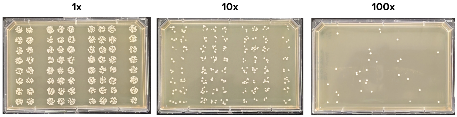 Ginkgo’s Catalyst software enables full parameterization of the drop plating settings along with other steps of the workflow to streamline different parameter value testing and ultimately ensure optimal performance by delivering uniform, bubble-free spots on the agar surface, not coalescing with the neighboring spots, and free from any agar surface puncture “scars”, interfering with the downstream colony imaging and picking steps (Fig 6).