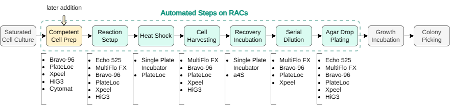 As workflow requirements tend to evolve and scientists progressively extend the use of lab automation in their workflows, the RAC platform’s unique architecture allows seamless adaptation as needs change. Here, we demonstrated how onboarding of a humidity-controlled shaking incubation RAC allowed for a retroactive addition of the upstream competent cell preparation workflow. Future expansion of the described RAC system could further improve the described workflows or enable additional downstream steps. In particular, addition of a plate washing RAC could accelerate the multi-step cell pellet washes, during competent cell preparation, addition of an acoustic volume detection RAC could enable upstream agar surface QC, while addition of a colony picking RAC could enable downstream clone isolation and re-arraying.