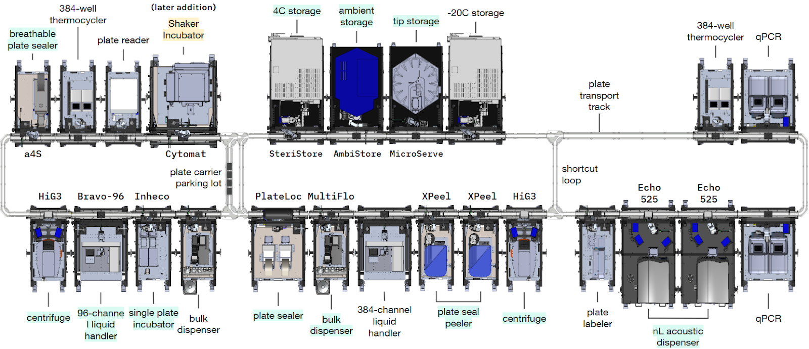 The end-to-end yeast DNA transformation workflow was divided into multiple steps as laid out in Fig 1. Each step was written as a separate protocol in Ginkgo’s Catalyst software, and was run consecutively on the RAC system at Ginkgo (Fig 2). Initial capabilities of the RAC system supported execution of most steps of the transformation workflow, except the upstream competent cell preparation and downstream solid media (agar) cell outgrowth and colony picking steps. A later expansion of the RAC system added a humidity-controlled shaking incubation capability, via a simple and quick RAC addition, which facilitated onboarding of the competent cell preparation step of the workflow. Similarly, other steps of the workflow, such as the colony picking, while out of scope for this technical note, can be onboarded with further expansion of the RAC system.